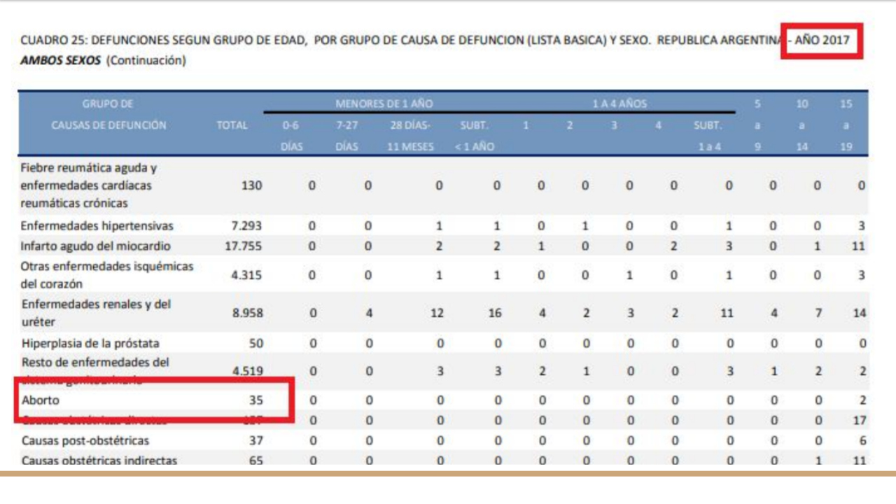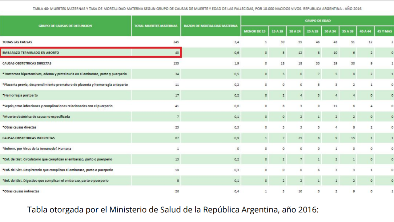 El tercer argumento que analizaremos en este artículo, es la afirmación de que, en nuestro país, mueren anualmente miles de mujeres por abortos clandestinos y que, por lo tanto, representa la principal causa de muerte materna. Al igual que con los argumentos anteriores, este argumento carece totalmente de cualquier tipo de sustento y no hay fuentes reales que avalen este número milenario. Por el contrario, al ingresar a las tablas oficiales ofrecidas por el Ministerio de Salud de la República Argentina, nos encontramos con una realidad completamente diferente: El número de mujeres muertas por abortos inducidos en 2017 fue de 35. Es preciso destacar que esto no solo representa menos de un 0,01% del total de muertes femeninasen la Argentina (lejísimo de ser la principal causa de muerte materna), sino que además, dentro de este número, se encuentran también los abortos espontáneos, es decir, naturales. Por lo tanto, el número de muertes producidos por abortos voluntarios es incluso mucho menor. Cabe aclarar que en 2017 (con 35 muertes), se ha reducido este número en un 20% respecto al 2016 (en el cual ocurrieron 43 muertes). Y a su vez, en 2016 se ha reducido en un 17,77% respecto al 2015 (pasando de 55 a 43). En conclusión, además de ser ínfima la cantidad reales de fallecimientos anuales (comparados a las miles de muertes que nos intenta proponer el movimiento abortista), año a año decrece linealmente la cantidad de fallecimientos anuales por aborto inducido.